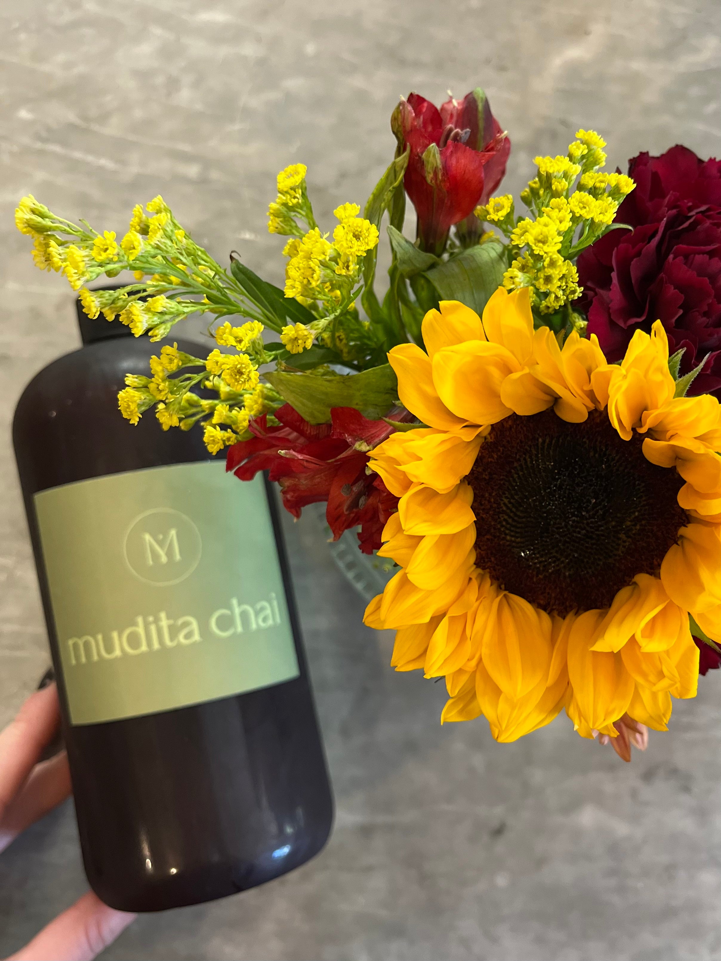 Mudita is a small-batch chai concentrate, slow-steeped in New Orleans, Louisiana. Mudita is a delicate balance of sweet and spicy ingredients comprised of freshly ground ginger, black pepper, cardamom, cloves, cinnamon and Assam black tea. Mudita offers warm spices with every sip.